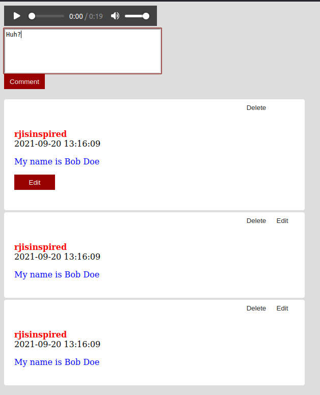 In the first comment posting, the edit button shows up in the lower left 3rds inside of the comment box. This red edit button is inactive and it somehow has taken the styling attributes of the comment button above. I am not sure why this is because separate class names and colors are used for the edit and delete buttons. I am confused as to why the edit button is showing like it is and it only happens inside of the first comment post and not with any posts after that.