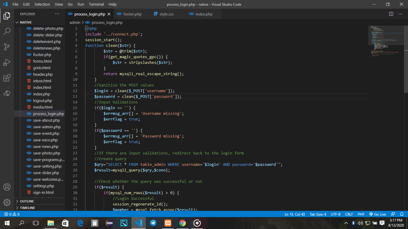 You should forget about the mysqli extension and convert the code to use the much simpler PDO extension, use prepared queries when supplying external, unknown, dynamic values to the query when it gets executed, and use exceptions for database statement errors. Also, use php’s password_hash() and password_verify() and don’t copy variables to other variables for no reason. Doing these things will greatly simplify the code and bring it up to current standards.