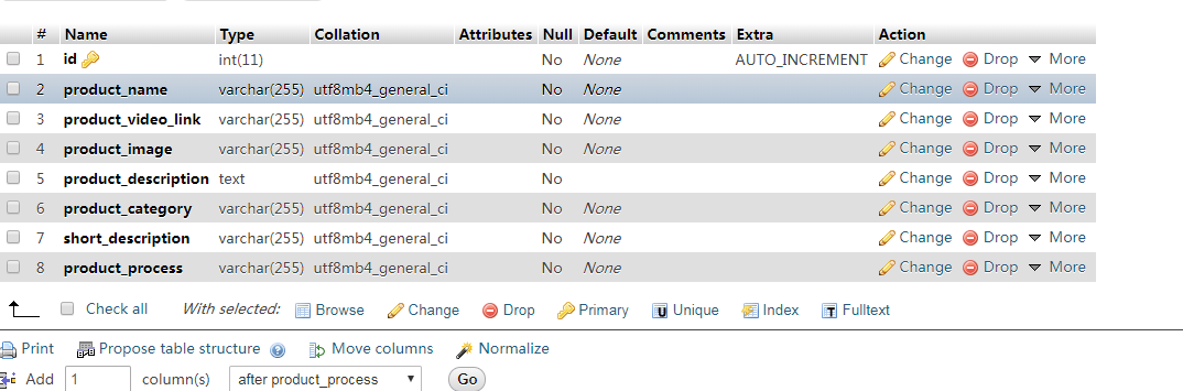 $query = mysqli_query($con, “INSERT INTO products( product_name, product_video_link, product_image, product_description, product_category, short_description, product_process) VALUES (’$data[0]’, ‘$data[1]’, ‘$data[2]’, ‘$data[3]’, ‘$data[4]’, ‘$data[5]’, ‘$data[6]’)”);