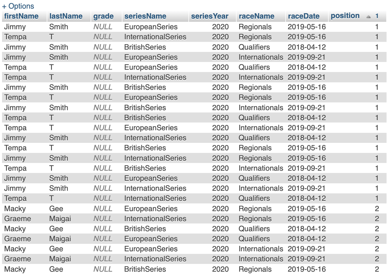 SELECT firstName, lastName, grade, seriesName, seriesYear, raceName, raceDate, position FROM member, series, race, competitor